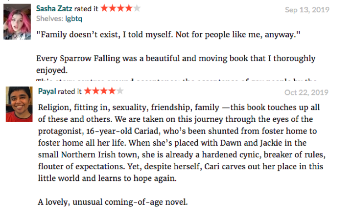 In the meantime I’m writing something new. It is such early stages that it’s impossible to talk about just yet. I seems like such a long time since Every Sparrow Falling came out and it was very hard to promote anything in 2020, so I’m going to post some reviews taken from Goodreads here. It means a great deal to hear feedback from readers. I am sure people don’t realise how much.